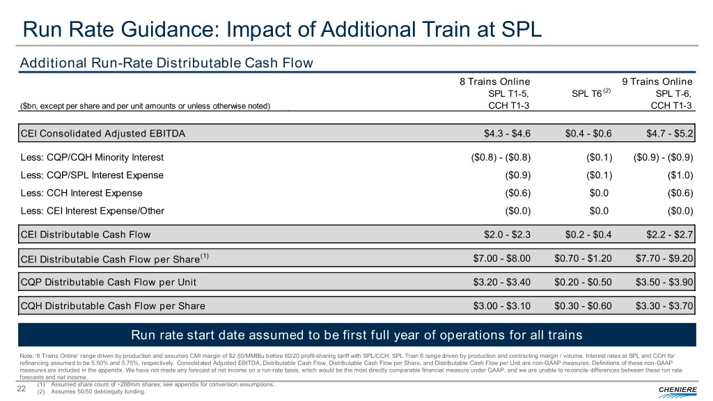 Run Rate Guidance 7 Trains Online 8 Trains Online SPL T1-5, SPL T1-5, ($bn, except per share and per unit amounts or unless otherwise noted) CCH T1-2 CCH T1-3 CEI Consolidated Adjusted EBITDA $3.8 - $4.1 $4.3 - $4.6 Less: CQP/CQH Minority Interest ($0.8) - ($0.8) ($0.8) - ($0.8) Less: CQP/SPL Interest Expense ($0.9) ($0.9) Less: CCH Interest Expense ($0.5) ($0.6) Less: CEI Interest Expense/Other ($0.0) ($0.0) CEI Distributable Cash Flow $1.7 - $1.9 $2.0 - $2.3 CEI Distributable Cash Flow per Share(1) $5.70 - $6.60 $7.00 - $8.00 CQP Distributable Cash Flow per Unit $3.20 - $3.40 $3.20 - $3.40 CQH Distributable Cash Flow per Share $3.00 - $3.10 $3.00 - $3.10 Run rate start date assumed to be first full year of operations for all trains Note: Range driven by production and assumes CMI margin of $2.50/MMBtu before 80/20 profit-sharing tariff with SPL/CCH. Interest rates at SPL and CCH for refinancing assumed to be 5.50% and 5.75%, respectively. Consolidated Adjusted EBITDA, Distributable Cash Flow, Distributable Cash Flow per Share, and Distributable Cash Flow per Unit are non-GAAP measures. Definitions of these non-GAAP measures are included in the appendix. We have not made any forecast of net income on a run- rate basis, which would be the most directly comparable financial measure under GAAP, and we are unable to reconcile differences between these run rate forecasts and net income. (1) Assumed share count of ~288mm shares; see appendix for conversion assumptions 21
