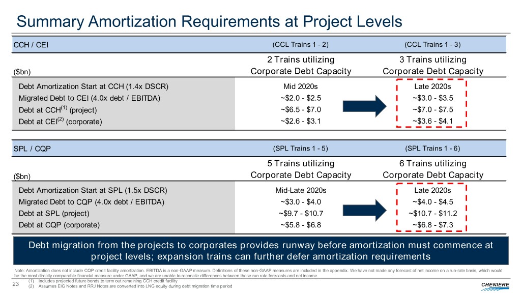 Run Rate Guidance: Impact of Additional Train at SPL Additional Run-Rate Distributable Cash Flow 8 Trains Online 9 Trains Online SPL T1-5, SPL T6 (2) SPL T-6, ($bn, except per share and per unit amounts or unless otherwise noted) CCH T1-3 CCH T1-3 CEI Consolidated Adjusted EBITDA $4.3 - $4.6 $0.4 - $0.6 $4.7 - $5.2 Less: CQP/CQH Minority Interest ($0.8) - ($0.8) ($0.1) ($0.9) - ($0.9) Less: CQP/SPL Interest Expense ($0.9) ($0.1) ($1.0) Less: CCH Interest Expense ($0.6) $0.0 ($0.6) Less: CEI Interest Expense/Other ($0.0) $0.0 ($0.0) CEI Distributable Cash Flow $2.0 - $2.3 $0.2 - $0.4 $2.2 - $2.7 CEI Distributable Cash Flow per Share(1) $7.00 - $8.00 $0.70 - $1.20 $7.70 - $9.20 CQP Distributable Cash Flow per Unit $3.20 - $3.40 $0.20 - $0.50 $3.50 - $3.90 CQH Distributable Cash Flow per Share $3.00 - $3.10 $0.30 - $0.60 $3.30 - $3.70 Run rate start date assumed to be first full year of operations for all trains Note: ‘8 Trains Online’ range driven by production and assumes CMI margin of $2.50/MMBtu before 80/20 profit-sharing tariff with SPL/CCH. SPL Train 6 range driven by production and contracting margin / volume. Interest rates at SPL and CCH for refinancing assumed to be 5.50% and 5.75%, respectively. Consolidated Adjusted EBITDA, Distributable Cash Flow, Distributable Cash Flow per Share, and Distributable Cash Flow per Unit are non-GAAP measures. Definitions of these non-GAAP measures are included in the appendix. We have not made any forecast of net income on a run-rate basis, which would be the most directly comparable financial measure under GAAP, and we are unable to reconcile differences between these run rate forecasts and net income. (1) Assumed share count of ~288mm shares; see appendix for conversion assumptions. 22 (2) Assumes 50/50 debt/equity funding.
