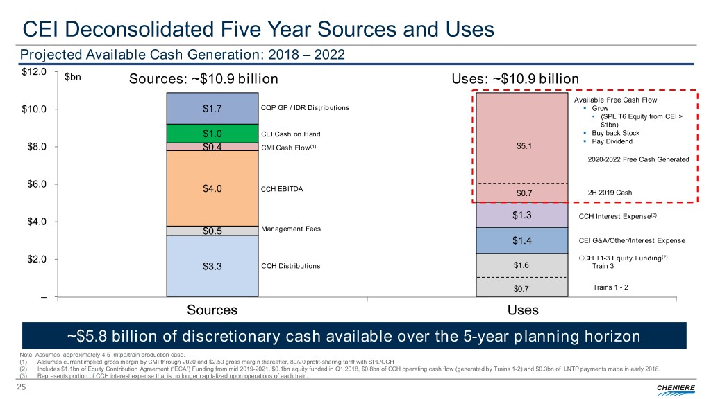 CEI and CQP Available Liquidity $bn $2.5 Total: $2.3 billion CCH General WC $0.1 Facility Capacity $2.0 $0.8 CEI Revolver Capacity Total: $1.4 billion $1.5 $0.1 CQP DSRA $0.5 Remaining CCH Contingency(4) $0.4 SPL DSRA $1.0 $0.1 CQP General WC Revolver Capacity(2) $0.1 SPL General WC Facility Capacity(3) $0.2 Remaining SPL Contingency(4) $0.5 $1.0 Cash on Hand(1) $0.4 Cash on Hand(1) $0.0 CEICEI CQPCQP Strong liquidity at CEI and CQP above and beyond project debt commitments and allocated contracted cash flow to more than cover the current 8-train program (1) Deconsolidated Cash on Hand as of March 31, 2018, net of working capital adjustments, all remaining unlevered SPL Train 5 capex, Train 5 portion of remaining capitalized interest expense and inclusive of restricted cash. (2) $115MM Revolver Tranche within CQP Credit Facilities (3) $75MM of $200MM SPL general working capital facility allocated for DSRA 24 (4) As of March 31, 2018 – CCH contingency inclusive of contingency associated with Train 3.