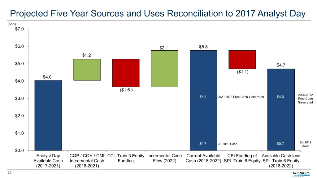 CEI Deconsolidated Five Year Sources and Uses Projected Available Cash Generation: 2018 – 2022 $12.0 $bn Sources: ~$10.9 billion Uses: ~$10.9 billion Available Free Cash Flow $10.0 $1.7 CQP GP / IDR Distributions . Grow • (SPL T6 Equity from CEI > $1bn) $1.0 CEI Cash on Hand . Buy back Stock . Pay Dividend $8.0 $0.4 CMI Cash Flow(1) $5.1 2020-2022 Free Cash Generated $6.0 CCH EBITDA $4.0 $0.7 2H 2019 Cash $1.3 CCH Interest Expense(3) $4.0 $0.5 Management Fees $1.4 CEI G&A/Other/Interest Expense $2.0 CCH T1-3 Equity Funding(2) $3.3 CQH Distributions $1.6 Train 3 $0.7 Trains 1 - 2 – SourcesSources UsesUses ~$5.8 billion of discretionary cash available over the 5-year planning horizon Note: Assumes approximately 4.5 mtpa/train production case. (1) Assumes current implied gross margin by CMI through 2020 and $2.50 gross margin thereafter, 80/20 profit-sharing tariff with SPL/CCH (2) Includes $1.1bn of Equity Contribution Agreement (“ECA”) Funding from mid 2019-2021, $0.1bn equity funded in Q1 2018, $0.8bn of CCH operating cash flow (generated by Trains 1-2) and $0.3bn of LNTP payments made in early 2018. (3) Represents portion of CCH interest expense that is no longer capitalized upon operations of each train. 25