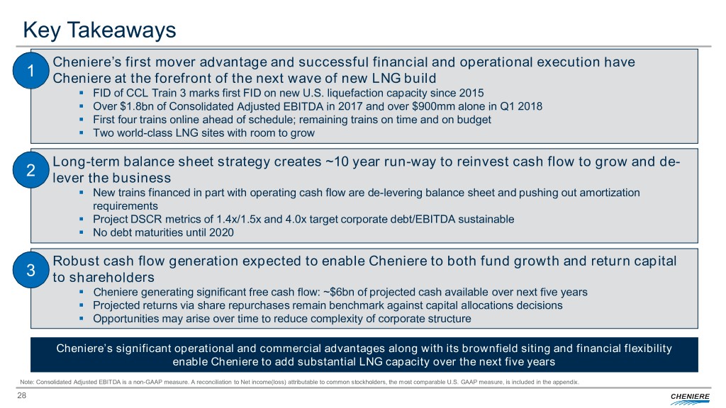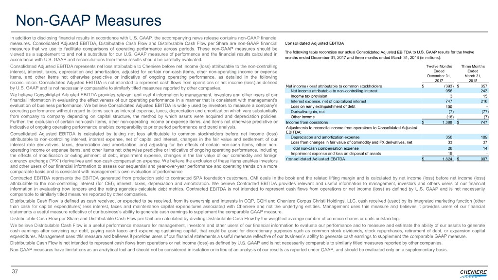 Non-GAAP Measures In addition to disclosing financial results in accordance with U.S. GAAP, the accompanying news release contains non-GAAP financial measures. Consolidated Adjusted EBITDA, Distributable Cash Flow and Distributable Cash Flow per Share are non-GAAP financial Consolidated Adjusted EBITDA measures that we use to facilitate comparisons of operating performance across periods. These non-GAAP measures should be viewed as a supplement to and not a substitute for our U.S. GAAP measures of performance and the financial results calculated in The following table reconciles our actual Consolidated Adjusted EBITDA to U.S. GAAP results for the twelve accordance with U.S. GAAP and reconciliations from these results should be carefully evaluated. months ended December 31, 2017 and three months ended March 31, 2018 (in millions): Consolidated Adjusted EBITDA represents net loss attributable to Cheniere before net income (loss) attributable to the non-controlling Twelve Months Three Months interest, interest, taxes, depreciation and amortization, adjusted for certain non-cash items, other non-operating income or expense Ended Ended items, and other items not otherwise predictive or indicative of ongoing operating performance, as detailed in the following December 31, March 31, reconciliation. Consolidated Adjusted EBITDA is not intended to represent cash flows from operations or net income (loss) as defined 2017 2018 by U.S. GAAP and is not necessarily comparable to similarly titled measures reported by other companies. Net income (loss) attributable to common stockholders $ (393 ) $ 357 Net income attributable to non-controlling interest 956 243 We believe Consolidated Adjusted EBITDA provides relevant and useful information to management, investors and other users of our Income tax provision 3 15 financial information in evaluating the effectiveness of our operating performance in a manner that is consistent with management’s Interest expense, net of capitalized interest 747 216 evaluation of business performance. We believe Consolidated Adjusted EBITDA is widely used by investors to measure a company’s Loss on early extinguishment of debt 100 - operating performance without regard to items such as interest expense, taxes, depreciation and amortization which vary substantially Derivative gain, net (7) (77) from company to company depending on capital structure, the method by which assets were acquired and depreciation policies. Other income (18 ) (7) Further, the exclusion of certain non-cash items, other non-operating income or expense items, and items not otherwise predictive or Income from operations $ 1,388 $ 747 indicative of ongoing operating performance enables comparability to prior period performance and trend analysis. Adjustments to reconcile income from operations to Consolidated Adjusted Consolidated Adjusted EBITDA is calculated by taking net loss attributable to common stockholders before net income (loss) EBITDA: attributable to non-controlling interest, interest expense, net of capitalized interest, changes in the fair value and settlement of our Depreciation and amortization expense 356 109 Loss from changes in fair value of commodity and FX derivatives, net 33 37 interest rate derivatives, taxes, depreciation and amortization, and adjusting for the effects of certain non-cash items, other non- operating income or expense items, and other items not otherwise predictive or indicative of ongoing operating performance, including Total non-cash compensation expense 28 14 the effects of modification or extinguishment of debt, impairment expense, changes in the fair value of our commodity and foreign Impairment expense and loss on disposal of assets 19 - currency exchange (“FX”) derivatives and non-cash compensation expense. We believe the exclusion of these items enables investors Consolidated Adjusted EBITDA $ 1,824 $ 907 and other users of our financial information to assess our sequential and year-over-year performance and operating trends on a more comparable basis and is consistent with management’s own evaluation of performance Contracted EBITDA represents the EBITDA generated from production sold to contracted SPA foundation customers, CMI deals in the book and the related lifting margin and is calculated by net income (loss) before net income (loss) attributable to the non-controlling interest (for CEI), interest, taxes, depreciation and amortization. We believe Contracted EBITDA provides relevant and useful information to management, investors and others users of our financial information in evaluating how lenders and the rating agencies calculate debt metrics. Contracted EBITDA is not intended to represent cash flows from operations or net income (loss) as defined by U.S. GAAP and is not necessarily comparable to similarly titled measures reported by other companies. Distributable Cash Flow is defined as cash received, or expected to be received, from its ownership and interests in CQP, CQH and Cheniere Corpus Christi Holdings, LLC, cash received (used) by its integrated marketing function (other than cash for capital expenditures) less interest, taxes and maintenance capital expenditures associated with Cheniere and not the underlying entities. Management uses this measure and believes it provides users of our financial statements a useful measure reflective of our business’s ability to generate cash earnings to supplement the comparable GAAP measure. Distributable Cash Flow per Share and Distributable Cash Flow per Unit are calculated by dividing Distributable Cash Flow by the weighted average number of common shares or units outstanding. We believe Distributable Cash Flow is a useful performance measure for management, investors and other users of our financial information to evaluate our performance and to measure and estimate the ability of our assets to generate cash earnings after servicing our debt, paying cash taxes and expending sustaining ca