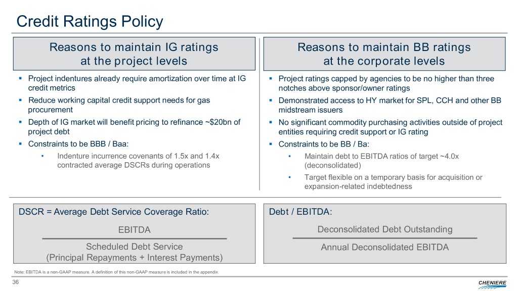 Long-term Capital Structure Plan . Utilize leverage capacity at CQP and CEI (the corporate levels) to delever SPL and CCH (the project levels) over the next 5-10 years . Debt incurrence test will force the deleveraging of SPL and CCH over time at 1.5x/1.4x DSCR . By migrating project debt up to CQP and CEI (subject to target ~4.0x decon. debt / EBITDA constraint), project level debt amortization requirements can be pushed out to the mid to late 2020s . Plan maximizes value to equity holders while adhering to indenture amortization requirements at the project levels . Investment grade ratings at the project levels and strong high yield (“HY”) ratings (BB / Ba) at the corporate levels can be achieved and maintained . This framework provides CEI significant free cash flow to invest and grow which can further defer substantial debt pay down, while at the same time returning capital to shareholders via share repurchases and/or dividends By taking advantage of leverage capacity at the corporate levels, project level debt amortization not required until the mid to late 2020s, even with no growth beyond 8 trains 35
